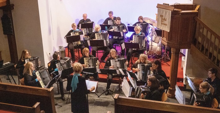 Das erste Konzert in der ev. Kirche Banfe des Akkordeonorchesters Ferndorftal-Wilden liegt nun 10 Jahre zurück. Es ist zur Tradition geworden, dass am Volkstrauertag in der kleinen wunderschönen Kirche ein Akkordeonkonzert stattfindet. An diesem Sonntag, den 19.11.2023 spielte das Akkordeonorchester erstmals hier unter dem Dirigat von Jutta Heinrich-Reichel. Die langjährige Spielerin in der ersten Stimme hat den Taktstock erst vor wenigen Wochen übernommen. Mit viel Gefühl und Freude führt sie das Orchester präzise und souverän durch das moderne und abwechslungsreiche Programm. Als Ouvertüre zu diesem Konzertnachmittag spielte das Akkordeonorchester „Concerto d´Amore“ – eine Komposition von Jacob de Haan, die Barock mit Pop und Swing verbindet. Solistin Karolin Münker am Elektronium spielte anschließend begleitet vom Orchester einfühlsam die berühmte „Gabriel´s Oboe“ aus dem Film „The Mission“. Mit „Carol of the Bells“ stimmte das Akkordeonorchester mit dem imitierten Glockengeläut das Publikum auf die bevorstehende Weihnachtszeit ein. Modern arrangierte Popsongs von „The Sound of Silence“ bis „Shallow“ von Lady Gaga überzeugten die Zuhörer, dass Akkordeon mehr kann als oft vermutet: modern und auffällig anders. „Don´t stop me now“ – dieses Stück wurde von Freddie Mercury für seine Band komponiert. Es war das abschließende Stück des Konzertnachmittags. Dieses Arrangement für Akkordeonorchester ist das neueste aus Feder der Dirigentin Jutta Heinrich-Reichel. Das Orchester liebt es zu spielen und diese Spielfreude bekam das Publikum zu spüren. Nach zwei Zugaben und mit lieben Abschiedsworten von Pfarrer i.R. Mayer-Ullmann im Gepäck verließen alle Gäste die kleine feine Kirche in Banfe.