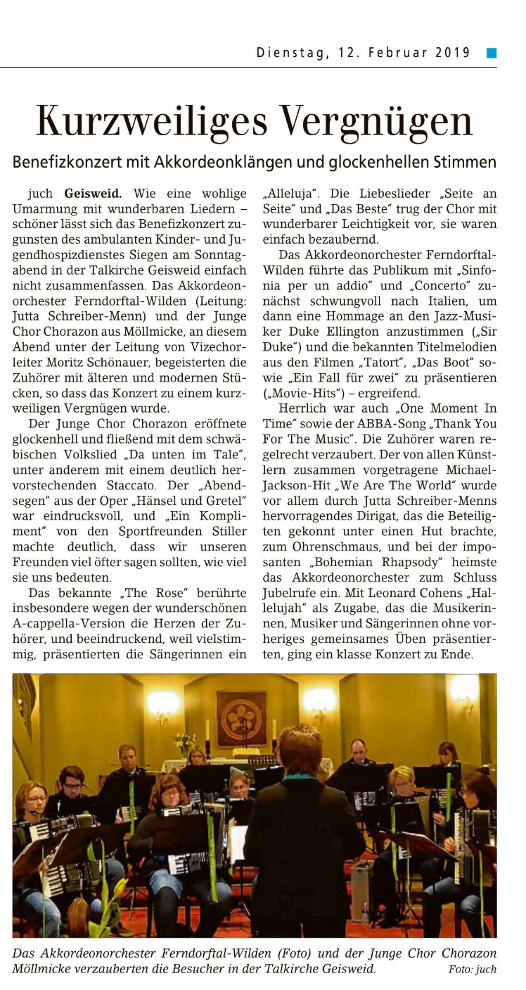 Bericht Benefizkonzert am Tag der Kinderhospizarbeit 12.02.2019 Siegener Zeitung - Akkordeonorchestergemeinschaft Ferndorftal-Wilden