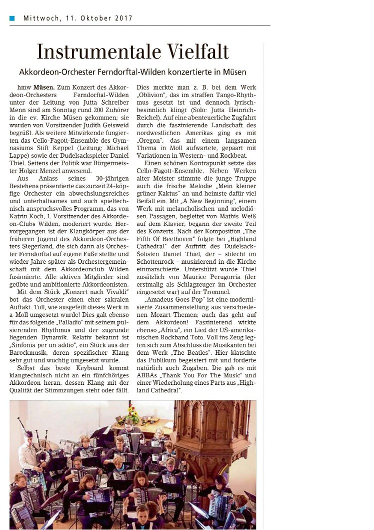 Bericht Kirchenkonzert Müsen 08.10.2017 Siegener Zeitung - Akkordeonorchestergemeinschaft Ferndorftal-Wilden