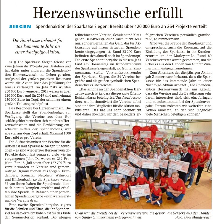 Berichtüber die Aktion Herzenswünsche der Sparkasse Siegen 19.07.2019 Siegener Zeitung